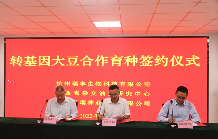9月17日,中心主任穆建新与杭州瑞丰生物科技有限公司董事长沈志成、陕西秦瑞种业科技有限公司董事长李晓锋签订转基因大豆合作育种协议。我中心大豆育种实力雄厚,成果转化成效显著,累计育成秦豆系列大豆品种10个,获得省、市科技奖5项,品种累计推广面积1000余万亩。杭州瑞丰拥有国内领先的生物育种科研平台,已经获得3项玉米转基因安全证书,成功研发了一系列具有推广应用前景的玉米和大豆转化体材料。本次转基因大豆合作育种协议的签订,目的就是聚合各方优势资源,共同推动和提升我省转基因大豆研发工作,开展“卡脖子”技术攻关,为培育具有市场竞争力的转基因大豆新品种打下坚实基础,为扩豆增油保供贡献杨凌力量。