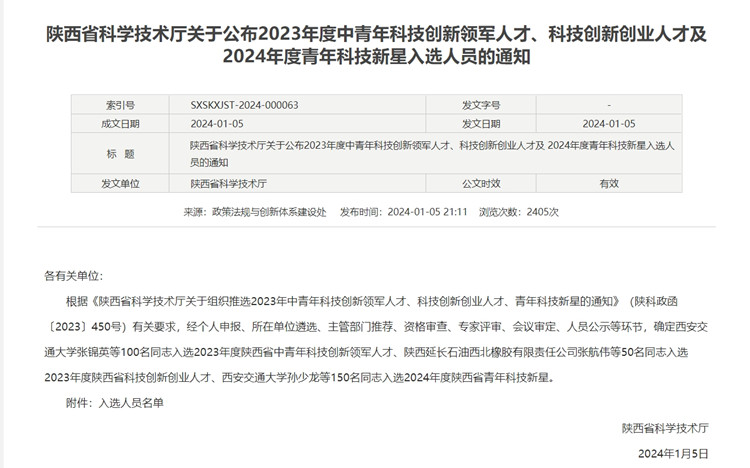 日前,省科学技术厅发布《关于公布2023年度中青年科技创新领军人才、科技创新创业人才及 2024年度青年科技新星入选人员》的通知,中心育种研究室关周博入选2023年度陕西省中青年科技创新领军人才。
