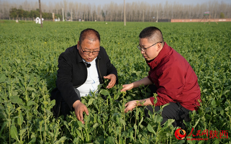 杨建利(左)讲解油菜春季管护要点。人民网记者 邹星摄