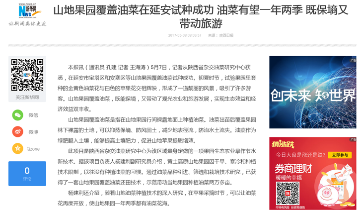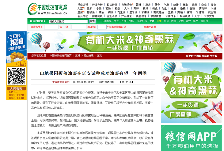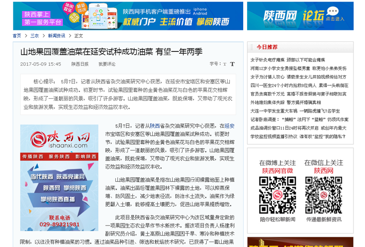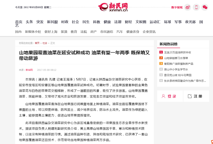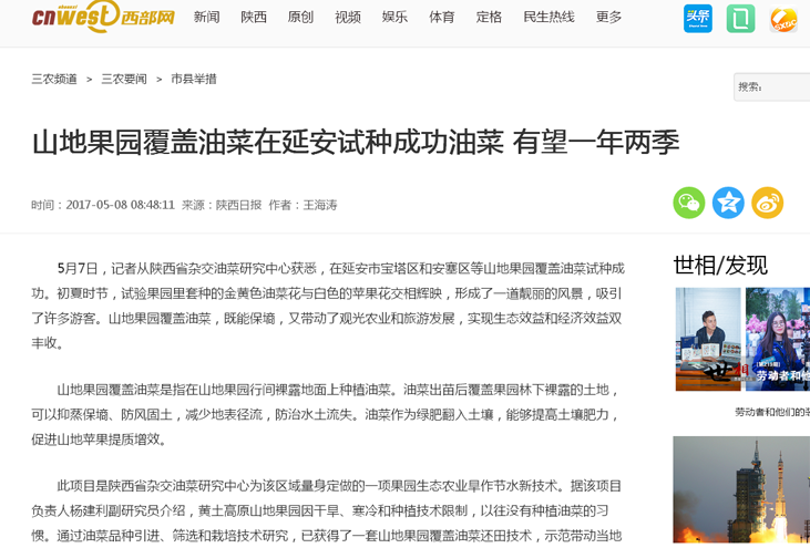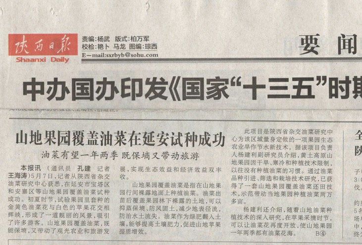 5月8日,《陕西日报》第7版报道我中心“山地果园覆盖油菜在延安试种成功”,新华网、陕西网、西部网等多家媒体相继转载报道。