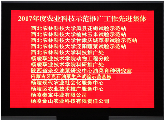 2月27日,杨凌示范区召开2018年工作会议,油菜育种研究室和我中心在内蒙古建立的牙克石油菜生产试验示范基地被评为示范区2017年度农业科技示范推广工作先进集体,王周礼同志被评为推广先进个人,受到大会表彰奖励。我中心作为驻区单位应邀出席,穆建新主任、李有利副书记、苟升学副主任等7人参加了会议。