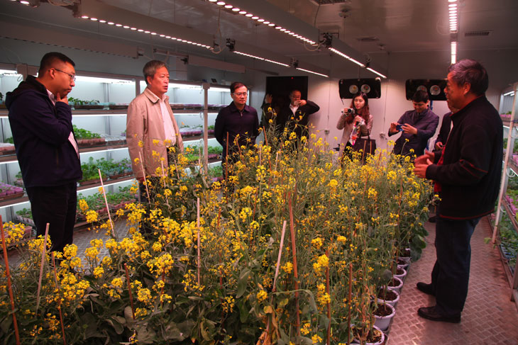 在中心副主任田建华研究员带领和讲解下,调研组一行人饶有兴趣的参观了油菜分子育种实验室、品质分析实验室,以及亲本繁育网室和加代温室等设施。详细了解了国家油菜育种科研工作的进展和中心的基本情况。中心副书记李有利陪同。