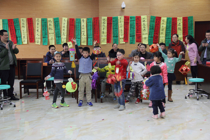 首先进行的是“声声报福”(组合踩气球)、“团团圆圆”(筷子夹乒乓)、“黄金宝座”(抢座争位子)比赛。在“声声报福”环节,科室组合、夫妻组合、亲子组合轮番登场;“团团圆圆”比赛中,选手凝神聚力,小小乒乓球玩出了新花样;最精彩的要数“黄金宝座”,每个人都专注的看着眼前的凳子,往往是音乐未停,大家已经叠坐成团,现场加油声、呐喊声和欢笑声此起彼伏,气氛热烈。观灯展、猜灯谜作为元宵活动的传统项目,今年也有了新创意,八个可爱的小朋友拿着大家亲手制作的灯笼走秀,萌态十足,赢得一片掌声。